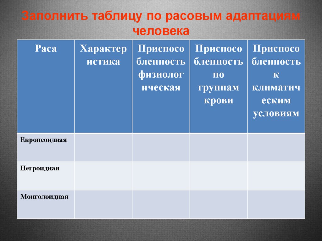 Заполнить таблицу по расовым адаптациямчеловека