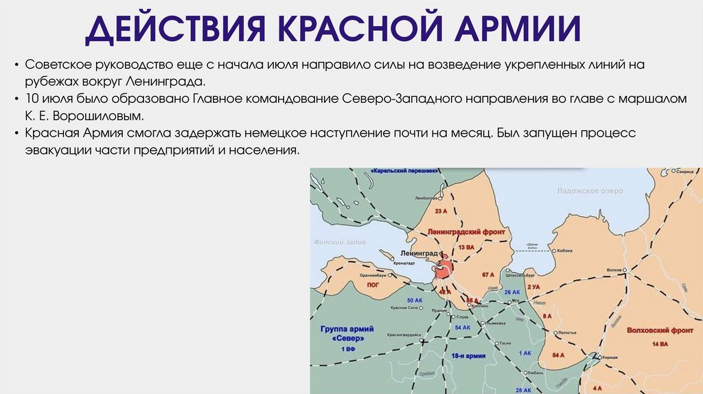 ДЕЙСТВИЯ КРАСНОЙ АРМИИ• Советское руководство еще с начала июля направило силы на возведение укрепленных линий на