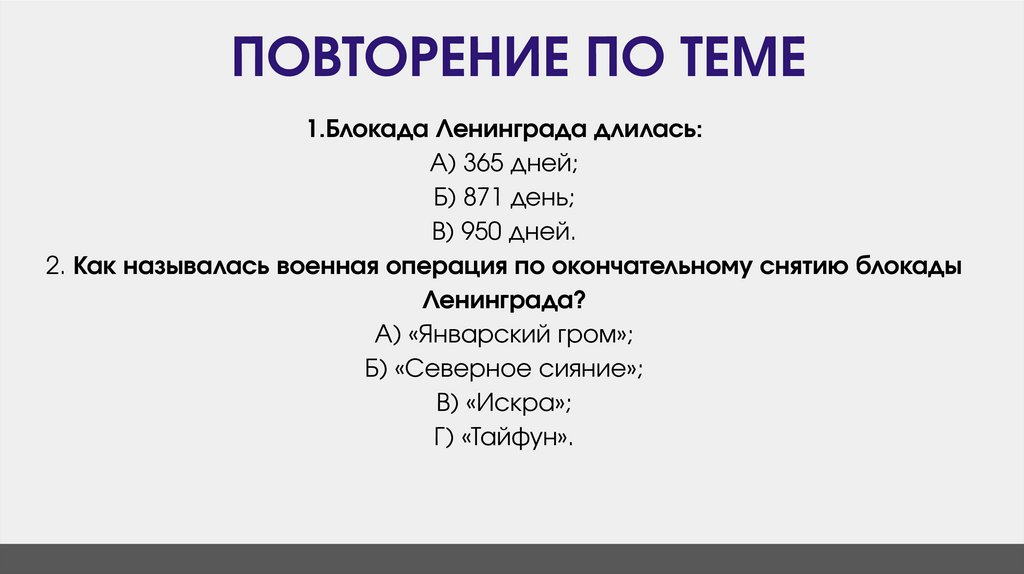 ПОВТОРЕНИЕ ПО ТЕМЕ1.Блокада Ленинграда длилась: