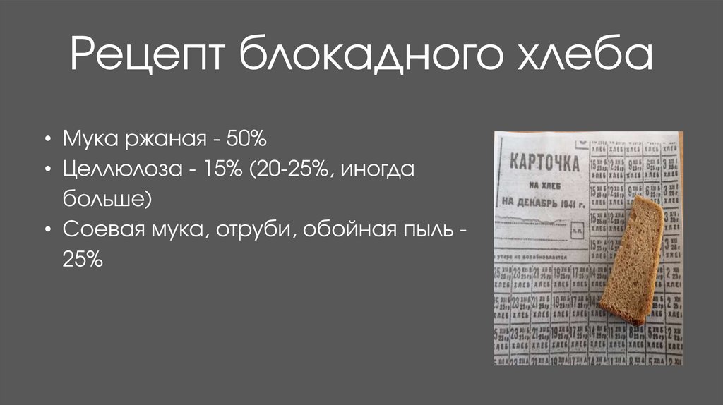 Рецепт блокадного хлеба• Мука ржаная - 50%