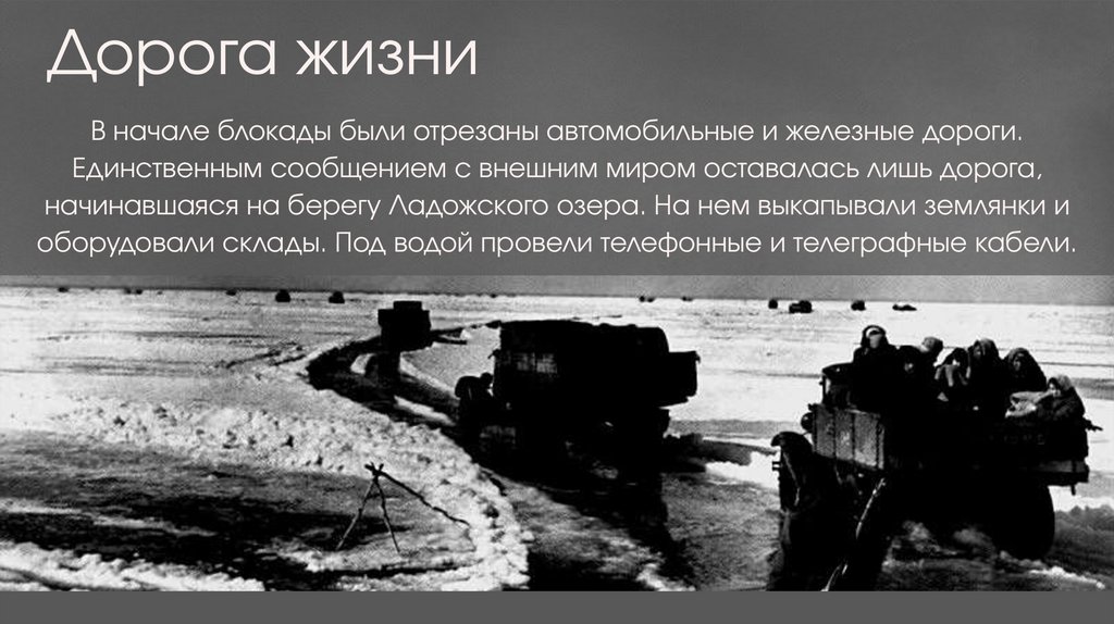 Дорога жизниВ начале блокады были отрезаны автомобильные и железные дороги.