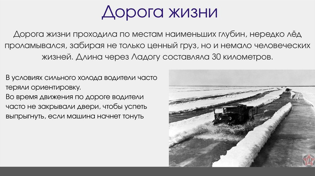 Дорога жизниДорога жизни проходила по местам наименьших глубин, нередко лёд