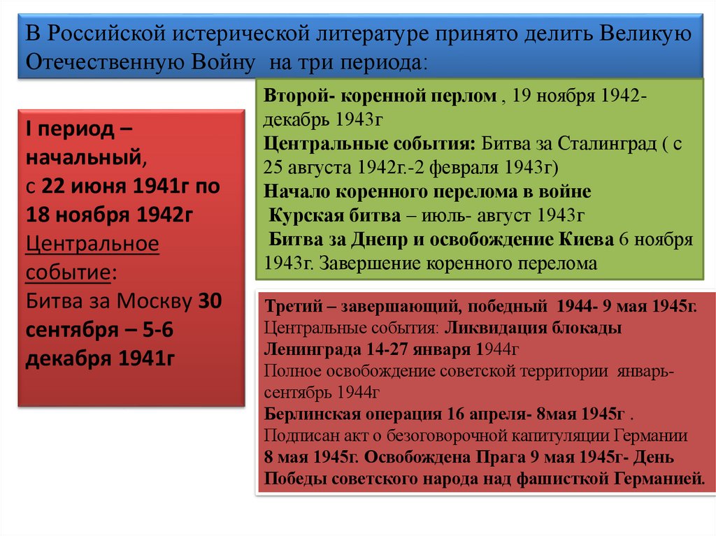 В Российской истерической литературе принято делить ВеликуюОтечественную Войну на три периода: