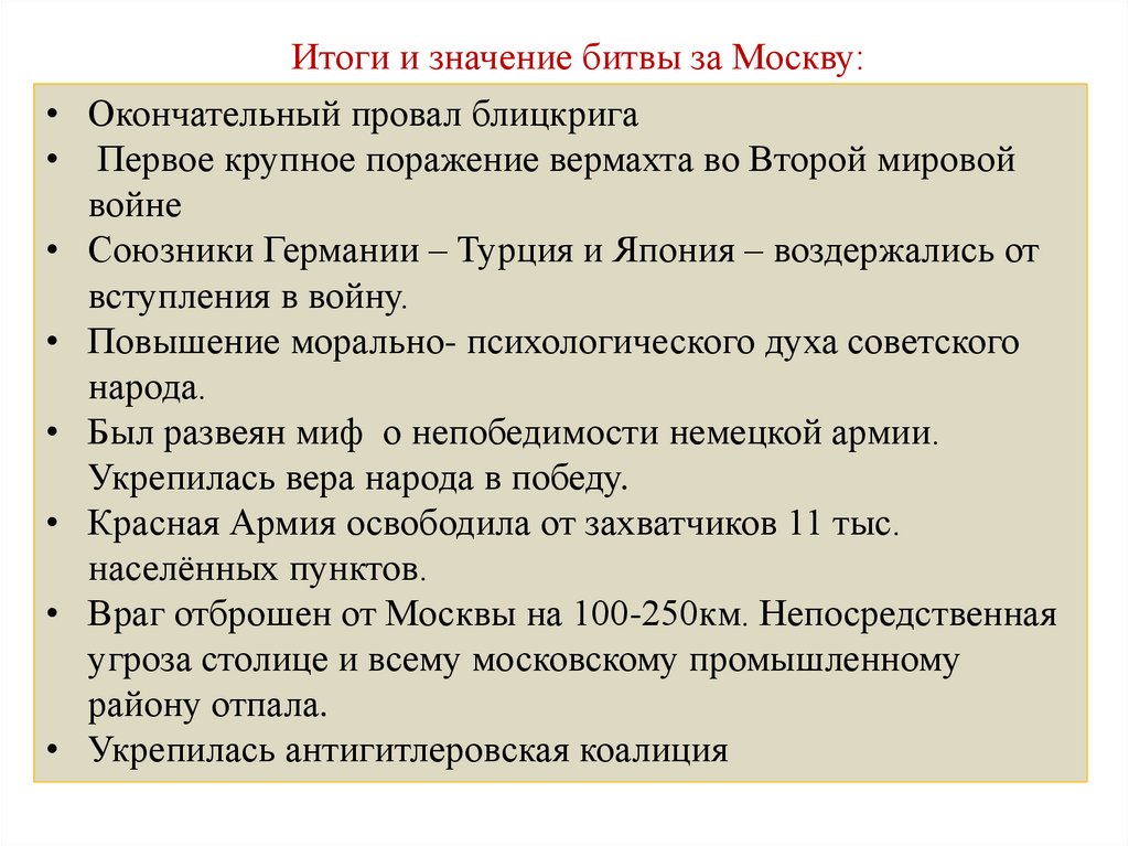 Итоги и значение битвы за Москву:• Окончательный провал блицкрига