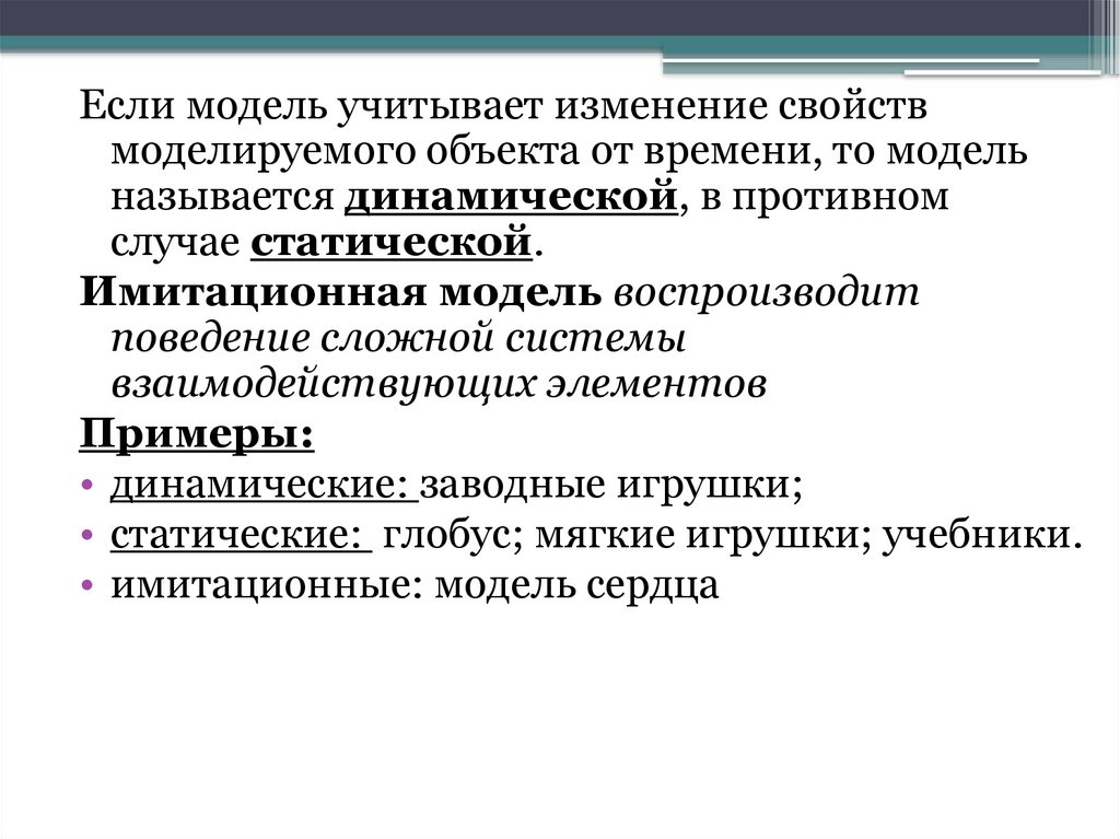 Если модель учитывает изменение свойствмоделируемого объекта от времени, то модель