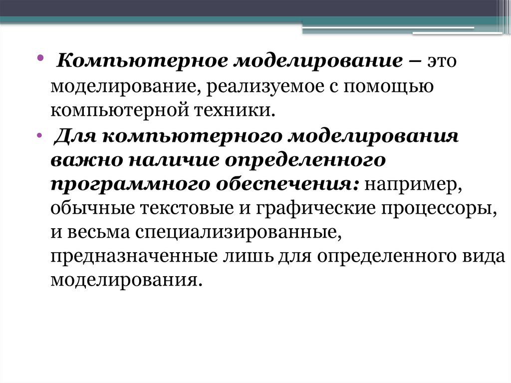 • Компьютерное моделирование – этомоделирование, реализуемое с помощью