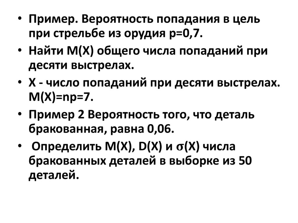 • Пример. Вероятность попадания в цельпри стрельбе из орудия р=0,7.