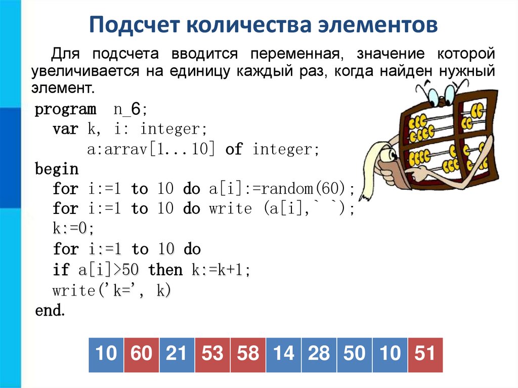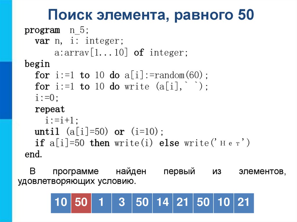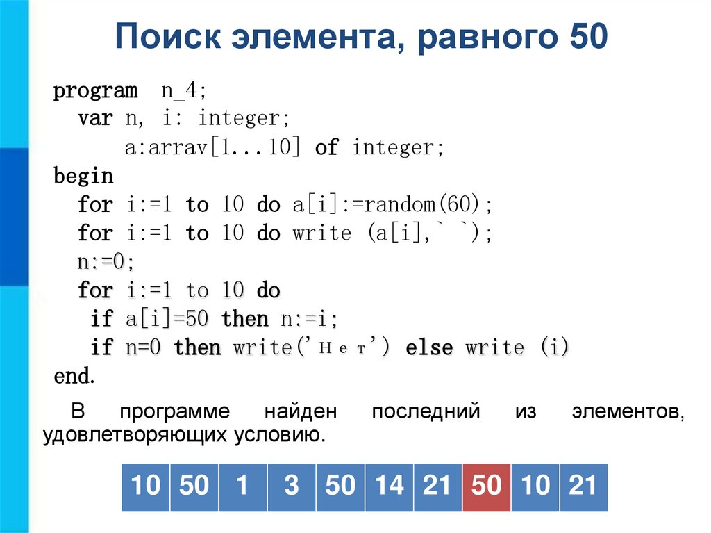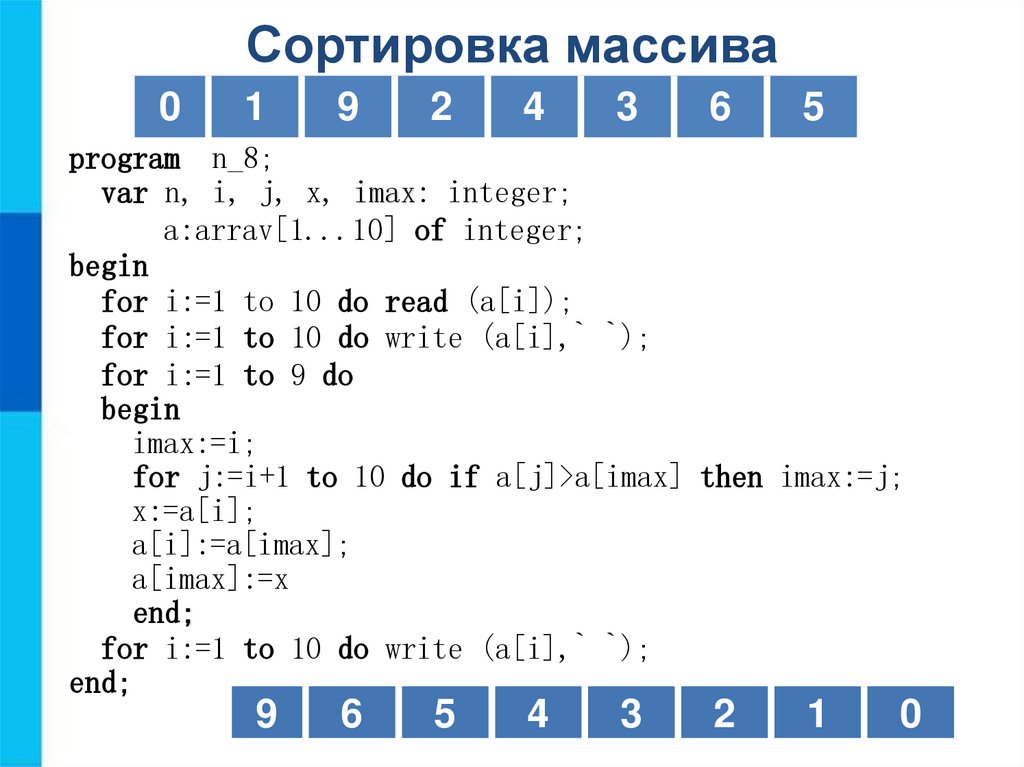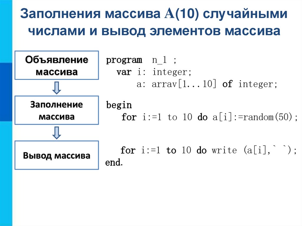 for i:=1 to 10 do writeln ('a[', i, ']=', a[i]);