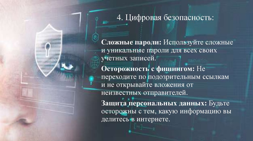 4. Цифровая безопасность:Сложные пароли: Используйте сложные