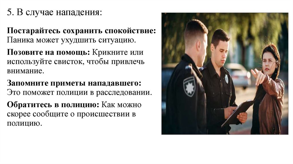 5. В случае нападения:Постарайтесь сохранить спокойствие: