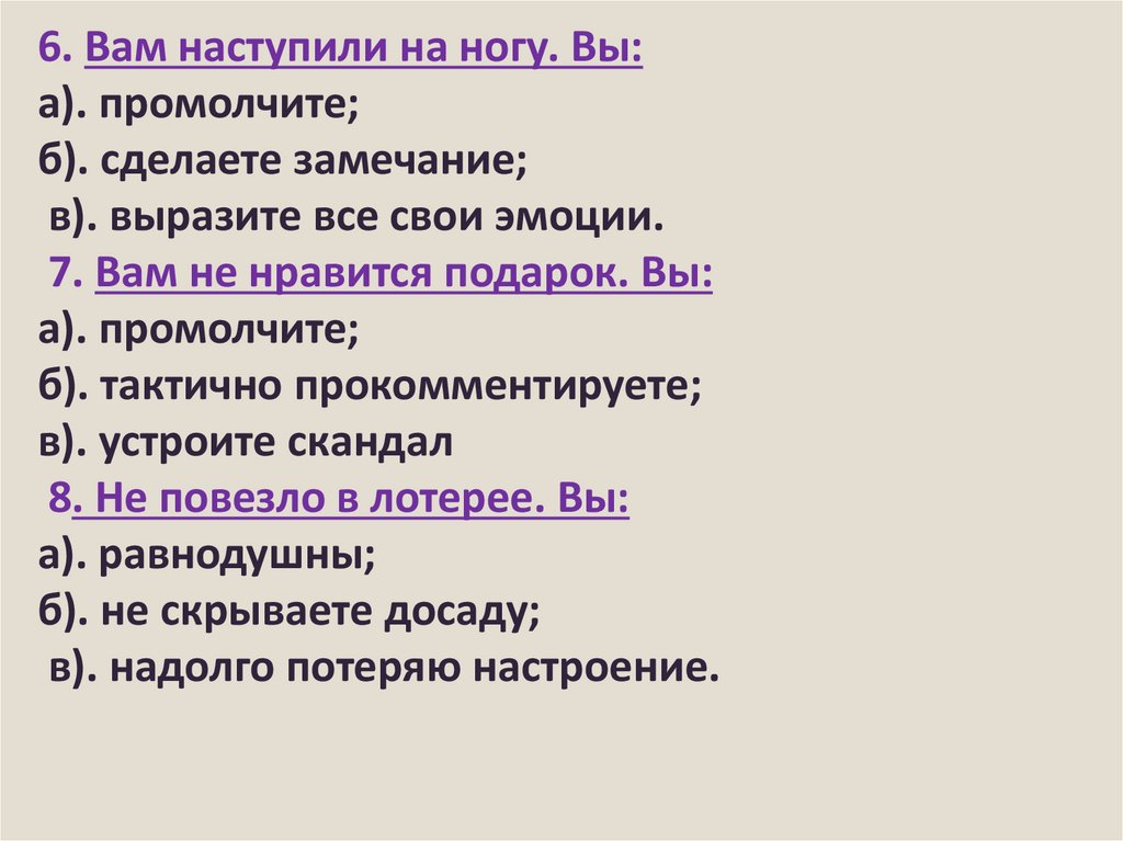 6. Вам наступили на ногу. Вы:а). промолчите;