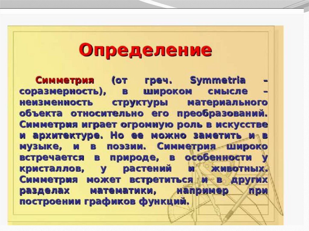Симметрия — слово греческого происхождения, как и многие другие слова, которыесвязаны с математикой. Оно означает соразмерность, наличие определённого порядка,