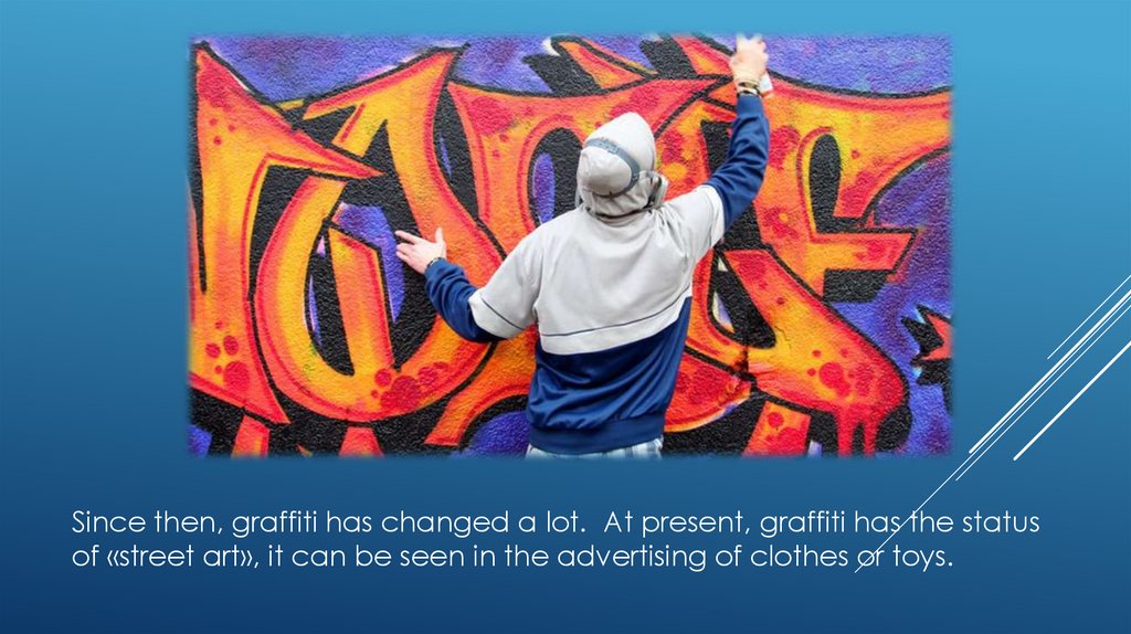 Since then, graffiti has changed a lot. At present, graffiti has the statusof «street art», it can be seen in the advertising of clothes or toys.