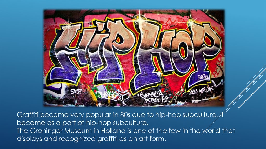 Graffiti became very popular in 80s due to hip-hop subculture. Itbecame as a part of hip-hop subculture.
