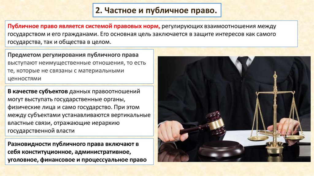 2. Частное и публичное право.Публичное право является системой правовых норм, регулирующих взаимоотношения между