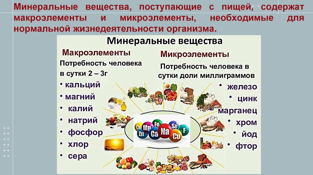 Минеральные вещества, поступающие с пищей, содержатмакроэлементы и микроэлементы, необходимые для