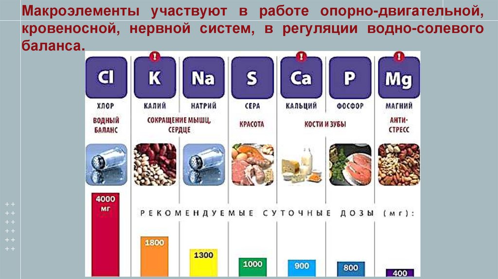 Макроэлементы участвуют в работе опорно-двигательной,кровеносной, нервной систем, в регуляции водно-солевого