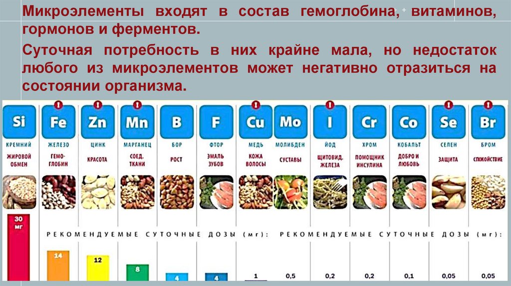 Микроэлементы входят в состав гемоглобина, витаминов,гормонов и ферментов.