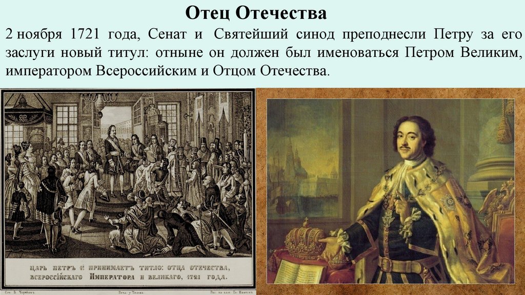 Отец Отечества2 ноября 1721 года, Сенат и Святейший синод преподнесли Петру за его
