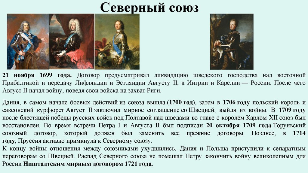 Северный союз21 ноября 1699 года. Договор предусматривал ликвидацию шведского господства над восточной
