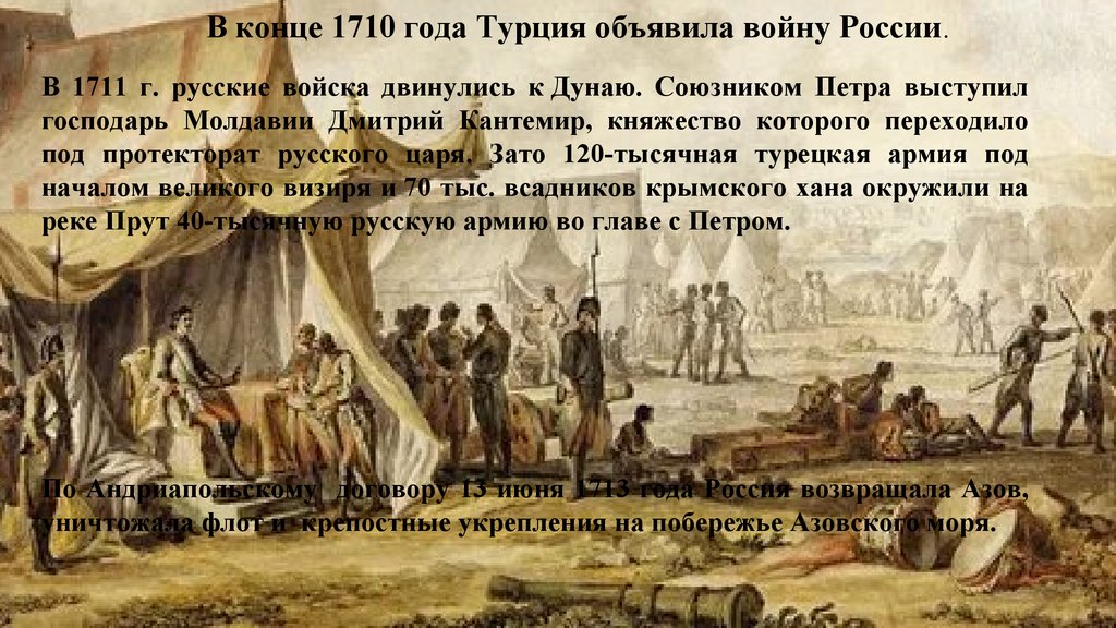 В конце 1710 года Турция объявила войну России.В 1711 г. русские войска двинулись к Дунаю. Союзником Петра выступил