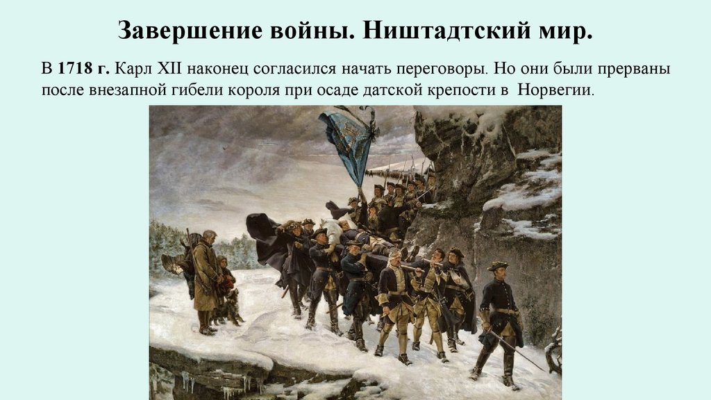 Завершение войны. Ништадтский мир.В 1718 г. Карл XII наконец согласился начать переговоры. Но они были прерваны