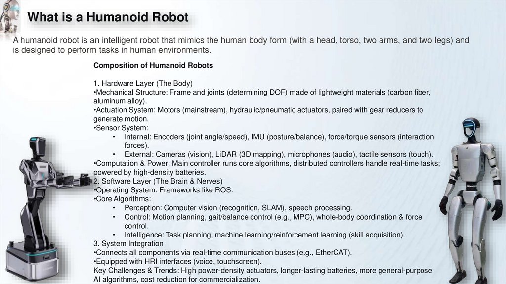 What is a Humanoid RobotA humanoid robot is an intelligent robot that mimics the human body form (with a head, torso, two arms, and two legs) and
