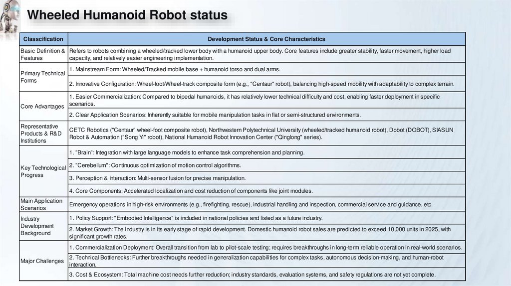 Humanoid / Wheeled Dual- The upper body features humanoid dual arms, while the lower body uses a wheeled