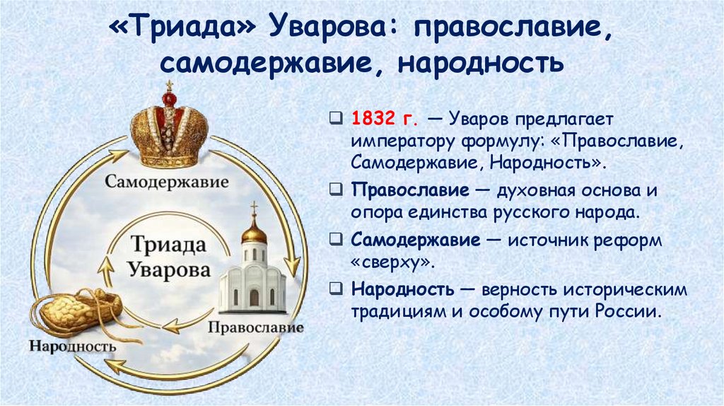 «Триада» Уварова: православие,самодержавие, народность