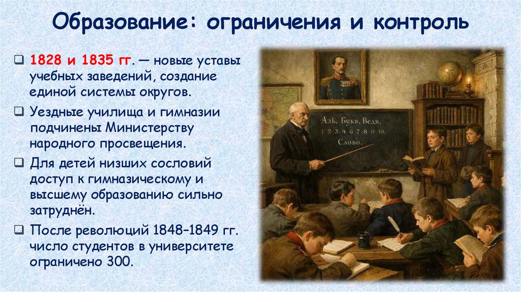Образование: ограничения и контроль1828 и 1835 гг. — новые уставы