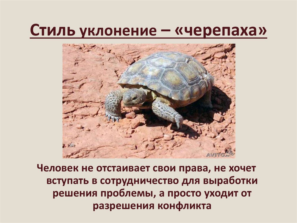 Стиль уклонение – «черепаха»Человек не отстаивает свои права, не хочет