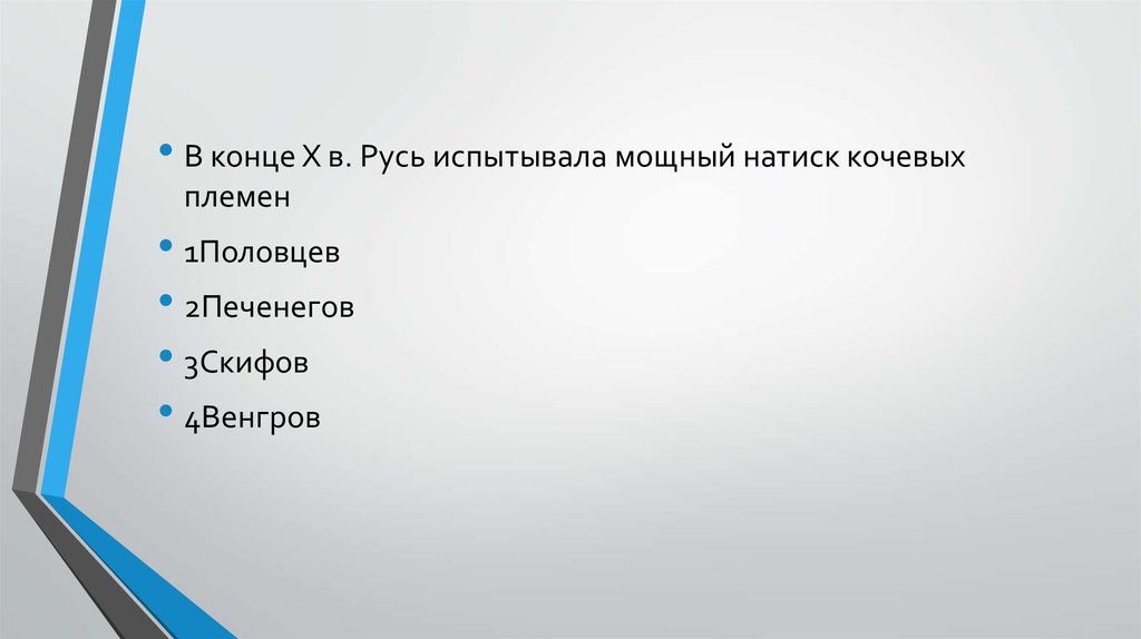 • В конце X в. Русь испытывала мощный натиск кочевыхплемен
