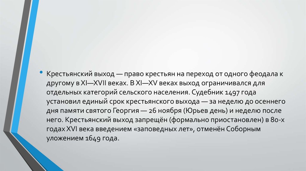 • Крестьянский выход — право крестьян на переход от одного феодала кдругому в XI—XVII веках. В XI—XV веках выход ограничивался для