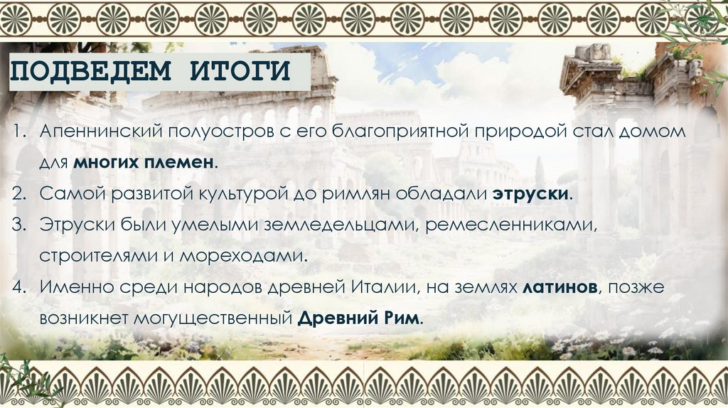 ПОДВЕДЕМ ИТОГИ1. Апеннинский полуостров с его благоприятной природой стал домом