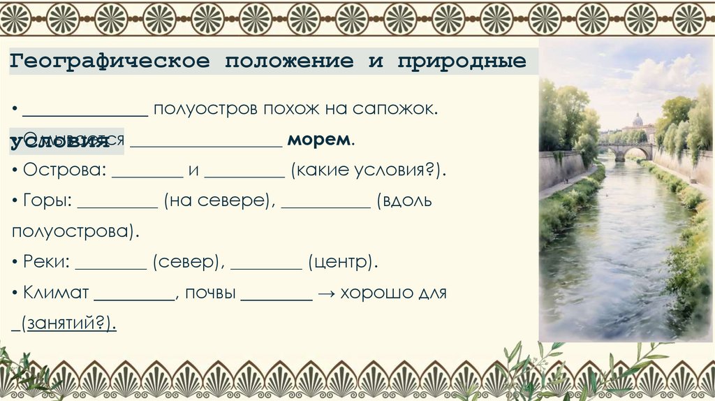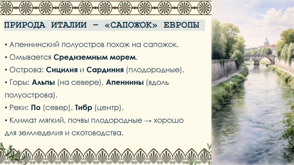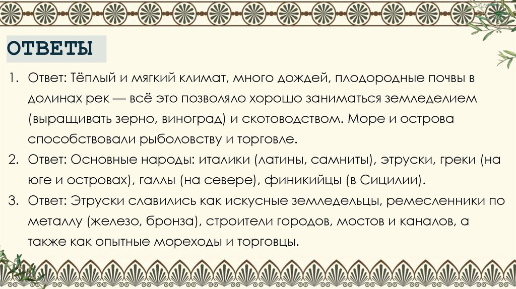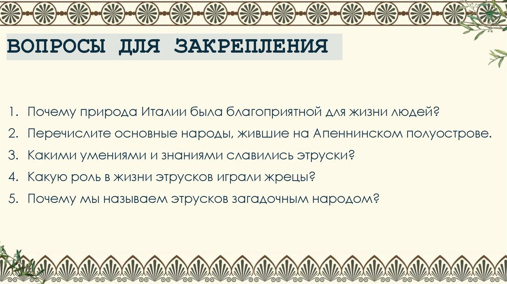 ВОПРОСЫ ДЛЯ ЗАКРЕПЛЕНИЯ1. Почему природа Италии была благоприятной для жизни людей?