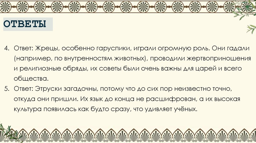 ОТВЕТЫ4. Ответ: Жрецы, особенно гаруспики, играли огромную роль. Они гадали