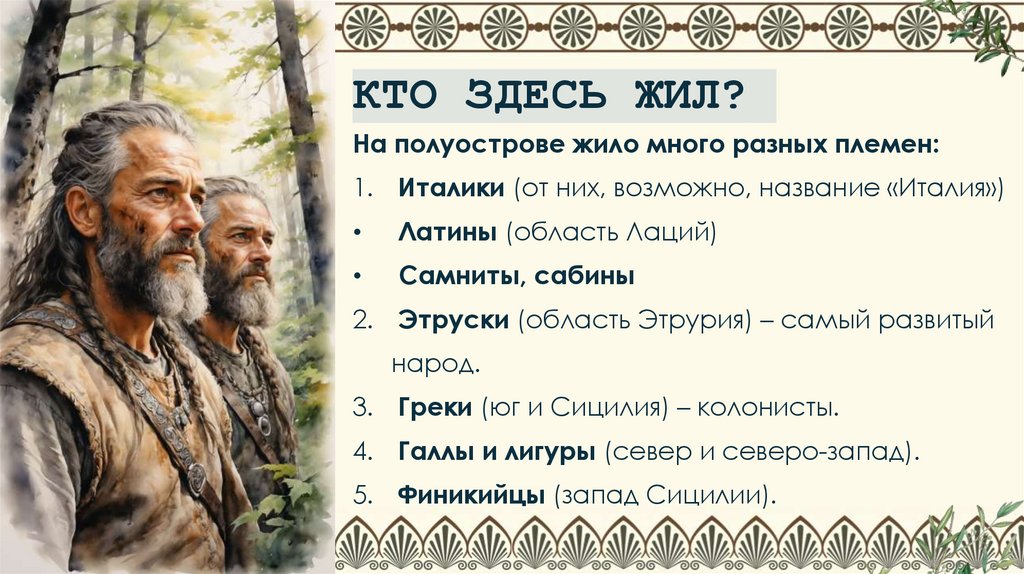2. Ответ: Основные народы: италики (латины, самниты), этруски, греки (на