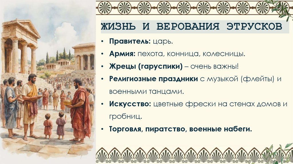 ЖИЗНЬ И ВЕРОВАНИЯ ЭТРУСКОВ• Правитель: царь.