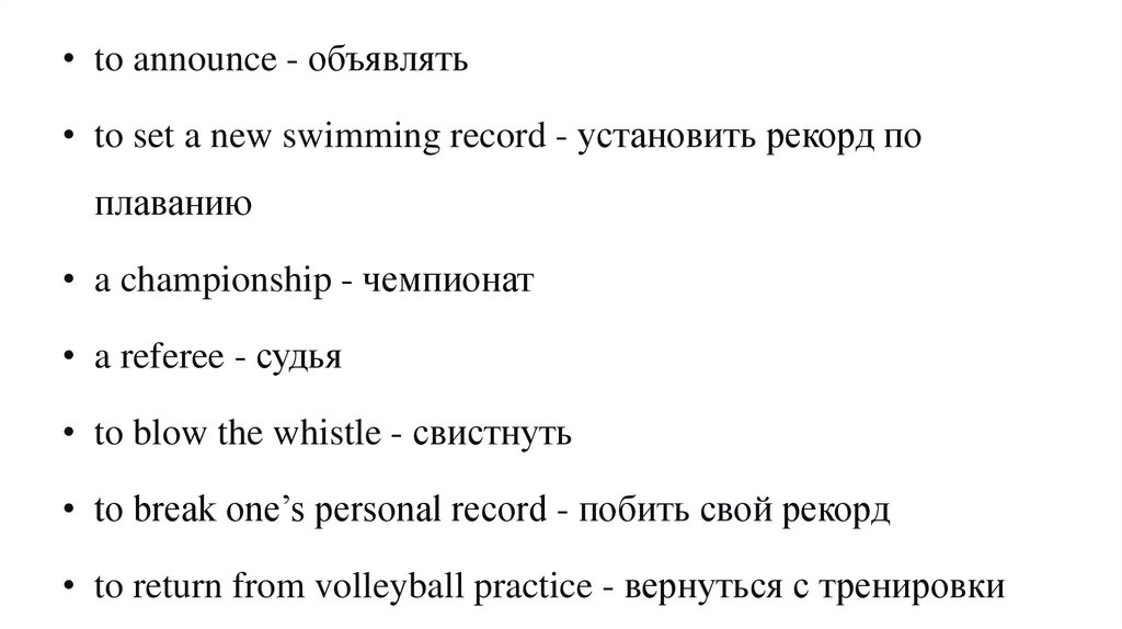 • to announce - объявлять• to set a new swimming record - установить рекорд по
