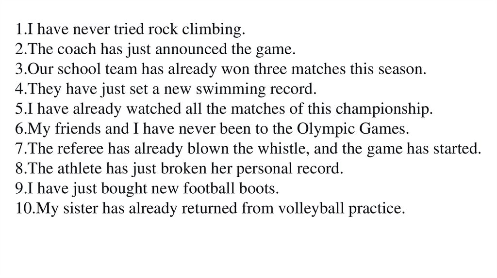 1.I have never tried rock climbing.2.The coach has just announced the game.