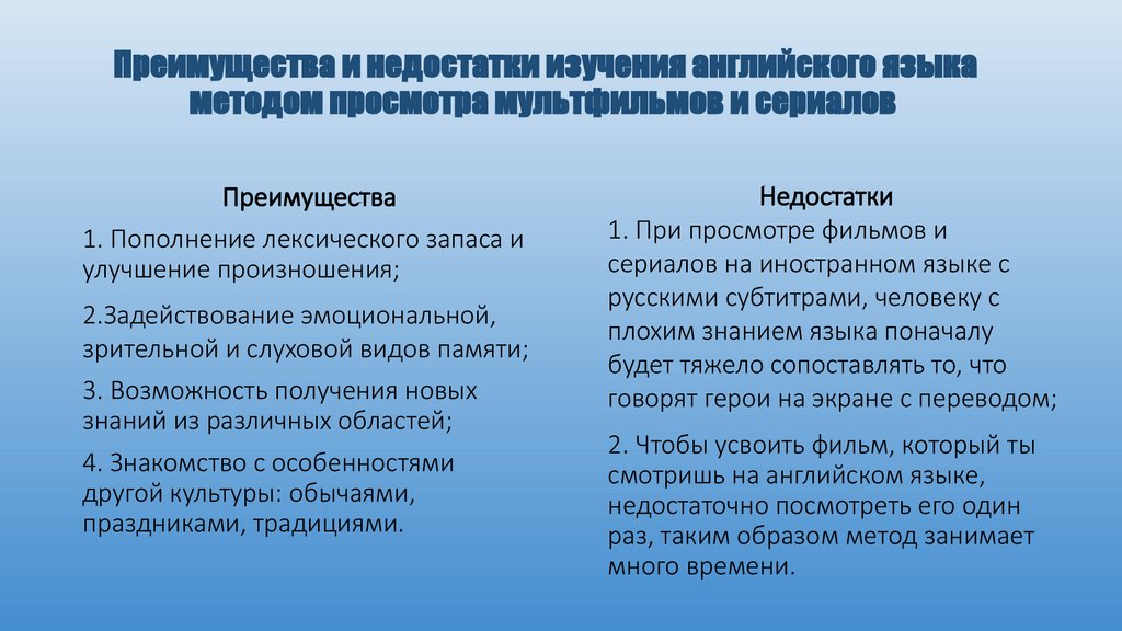 Преимущества и недостатки изучения английского языкаметодом просмотра мультфильмов и сериалов