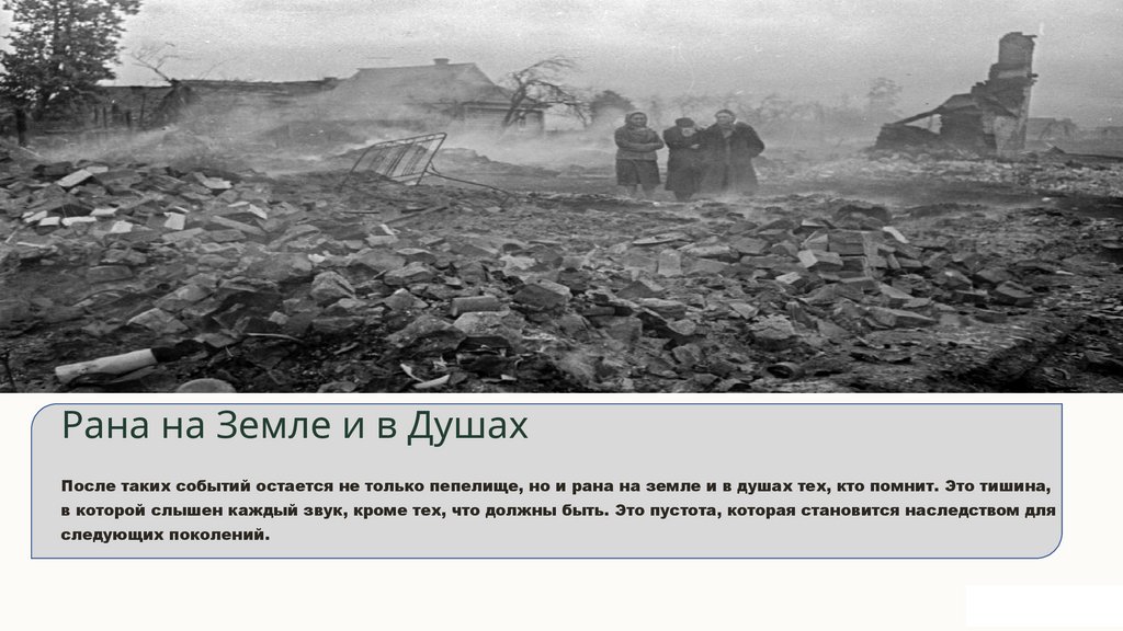 Рана на Земле и в ДушахПосле таких событий остается не только пепелище, но и рана на земле и в душах тех, кто помнит. Это тишина,
