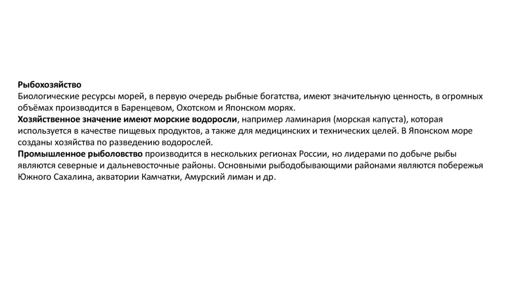 РыбохозяйствоБиологические ресурсы морей, в первую очередь рыбные богатства, имеют значительную ценность, в огромных
