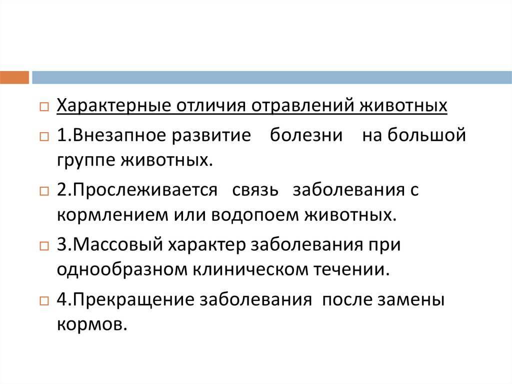 Характерные отличия отравлений животных1.Внезапное развитие болезни на большой