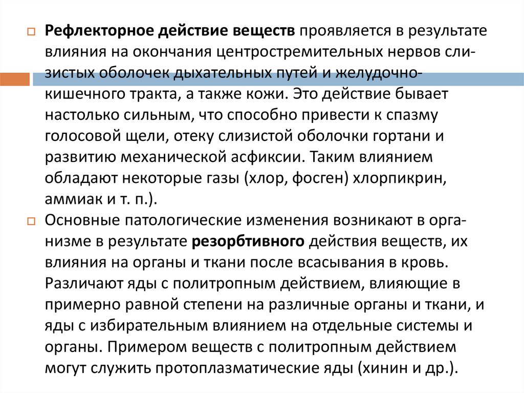 действия токсических веществ — местное, рефлекторное,