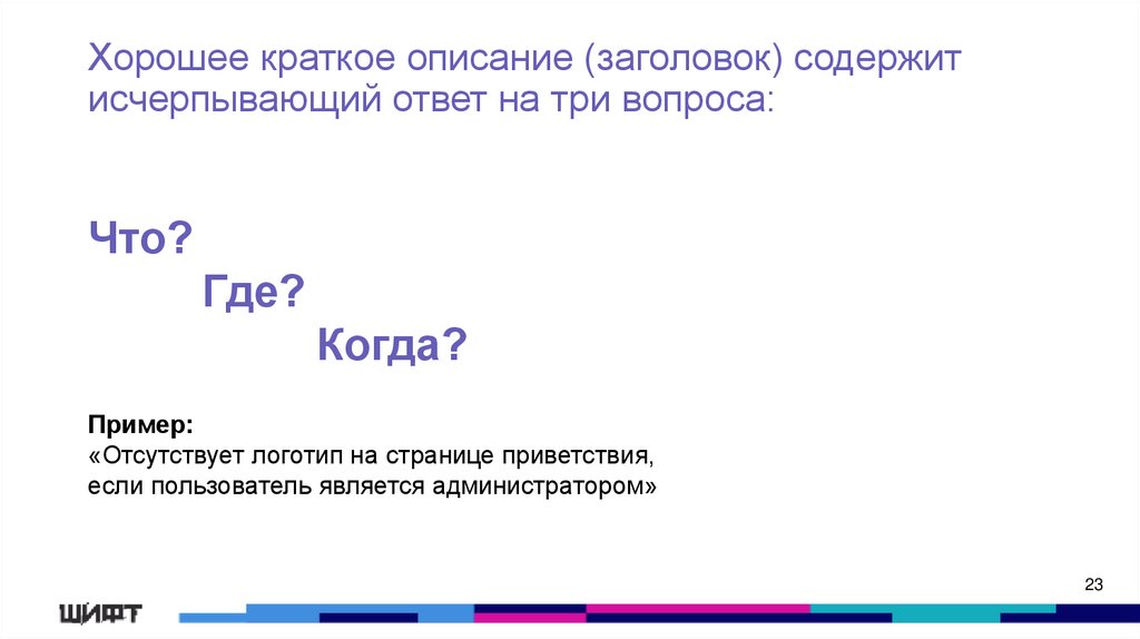 Хорошее краткое описание (заголовок) содержитисчерпывающий ответ на три вопроса: