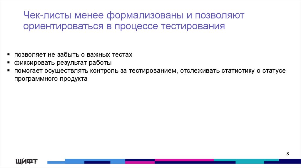 Чек-листы менее формализованы и позволяюториентироваться в процессе тестирования