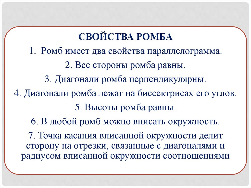 СВОЙСТВА РОМБА1. Рoмб имеет два свойства параллелограмма.