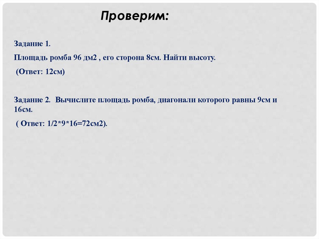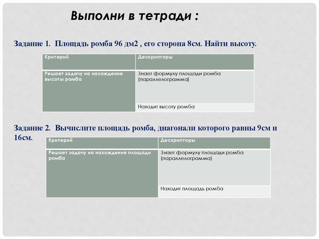 Выполни в тетради :Задание 1. Площадь ромба 96 дм2 , его сторона 8см. Найти высоту.