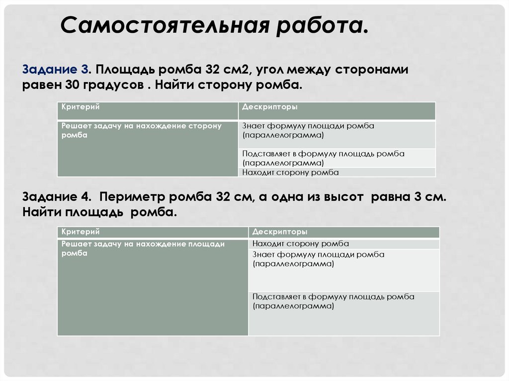 Самостоятельная работа.Задание 3. Площадь ромба 32 см2, угол между сторонами